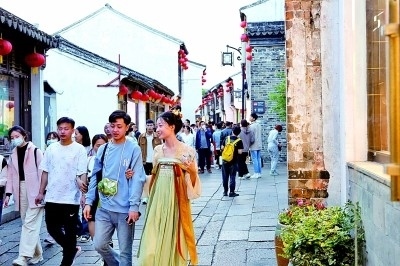 9月29日,湖北省宜昌市當(dāng)陽(yáng)市關(guān)陵景區(qū)人頭攢動(dòng)。不少游客身穿漢服,逛廟會(huì)、猜燈謎,重溫三國(guó)故事,共度佳節(jié)。