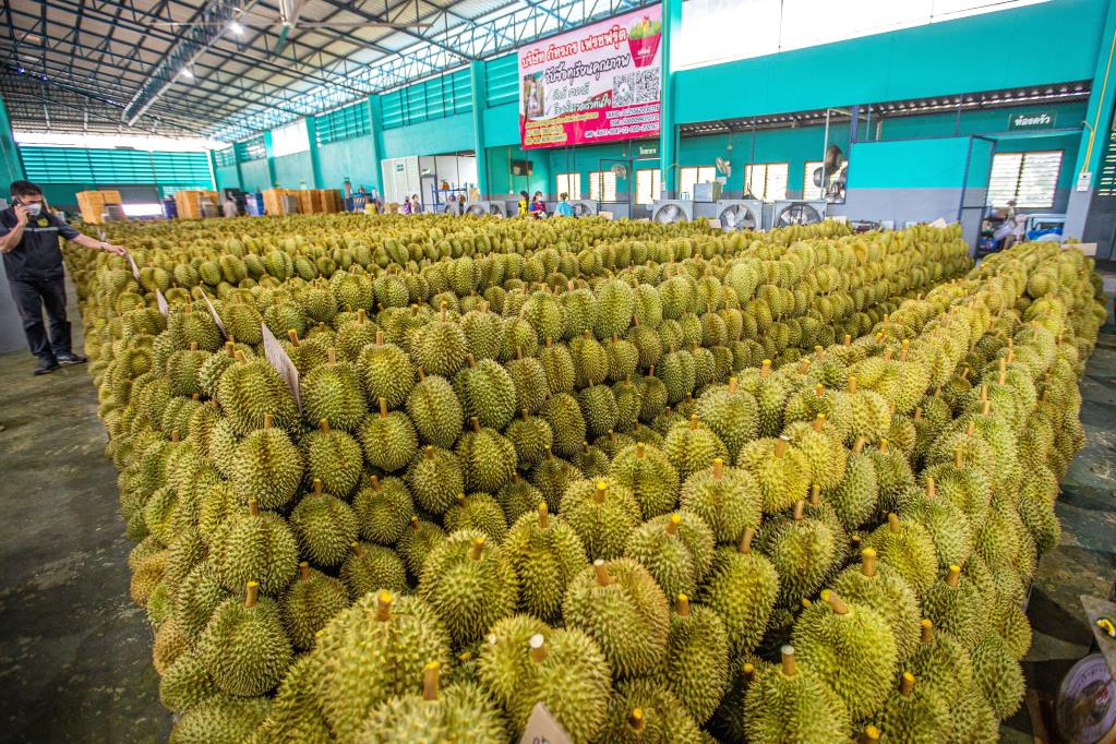 這是2022年5月5日在泰國(guó)尖竹汶府一家榴蓮分揀工廠拍攝的榴蓮。新華社記者 王騰 攝