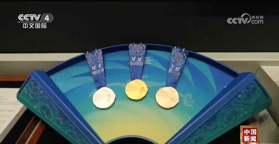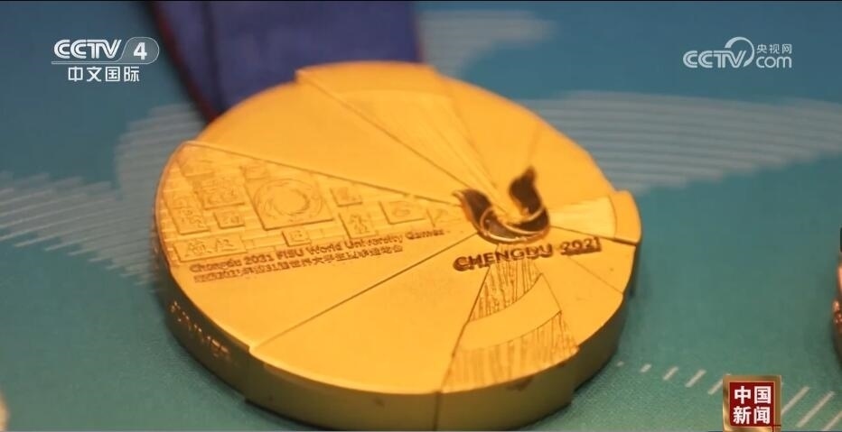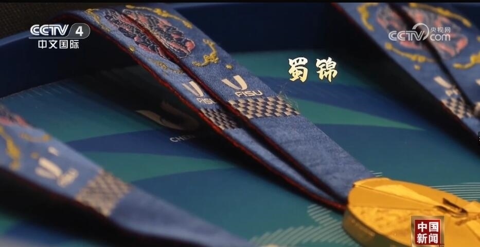 總臺(tái)記者 王豐:走進(jìn)成都大運(yùn)會(huì)博物館,最大的感受就是成都的元素?zé)o處不在。比如,我們剛一進(jìn)來,右手邊是成都大運(yùn)會(huì)的吉祥物蓉寶。看完蓉寶帶您來看看蓉光,什么是蓉光呢?獎(jiǎng)牌代表了成都大運(yùn)會(huì)的榮譽(yù),“蓉”是取自成都的簡(jiǎn)稱,包含了光榮和融合的含義,整個(gè)獎(jiǎng)牌的設(shè)計(jì)是呈現(xiàn)了不規(guī)則的圓形。另外,獎(jiǎng)牌的元素包含成都市的標(biāo)志——太陽(yáng)神鳥。此外,在獎(jiǎng)牌的綬帶設(shè)計(jì)上首次采用了蜀錦的制作工藝,實(shí)際上也是非物質(zhì)文化遺產(chǎn)活化利用的非常好的案例。