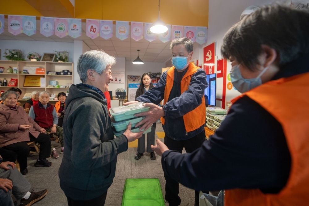 杭州市上城區(qū)南星街道白塔嶺社區(qū)志愿者在社區(qū)服務驛站為老人發(fā)放免費愛心午餐(2022年11月23日攝)。新華社記者 江漢 攝
