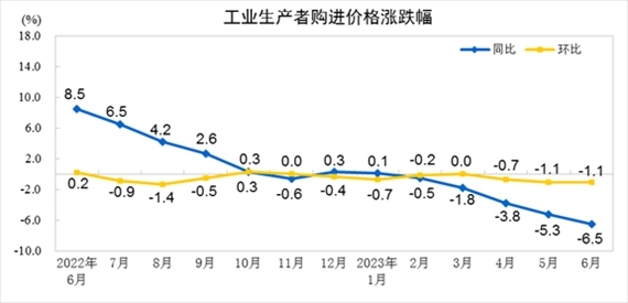 央視網(wǎng)消息:據(jù)國家統(tǒng)計局網(wǎng)站消息,2023年6月份,全國工業(yè)生產(chǎn)者出廠價格同比下降5.4%,環(huán)比下降0.8%;工業(yè)生產(chǎn)者購進價格同比下降6.5%,環(huán)比下降1.1%。上半年,工業(yè)生產(chǎn)者出廠價格比上年同期下降3.1%,工業(yè)生產(chǎn)者購進價格下降3.0%。