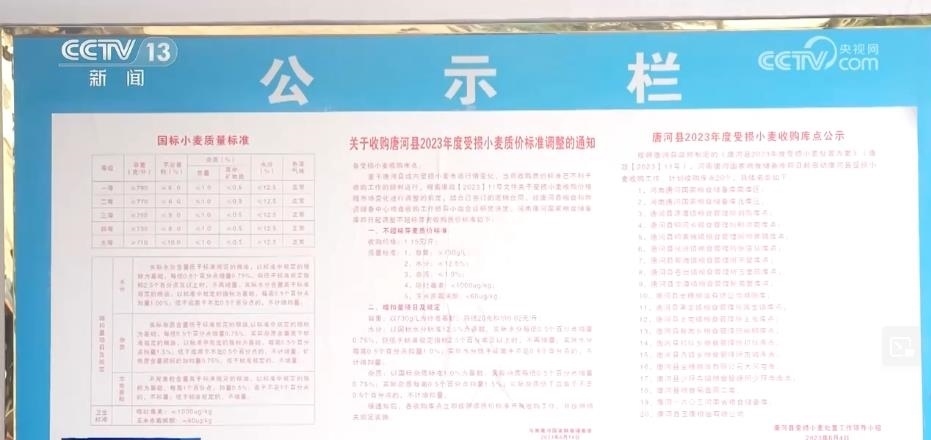 記者在這家糧食儲(chǔ)備庫(kù)的公示欄里看到了一份《收購(gòu)唐河縣受損小麥質(zhì)價(jià)標(biāo)準(zhǔn)調(diào)整的通知》,里面明確了受損小麥的收購(gòu)價(jià)格是1.15元每斤,而這個(gè)價(jià)格只比正常小麥?zhǔn)召?gòu)價(jià)1.4元左右低了0.3元。這張通知的落款日期是6月4日,而當(dāng)?shù)剞r(nóng)戶普遍是在6月3日收完糧食,這也在第一時(shí)間讓老百姓吃下了“定心丸”。
