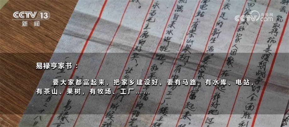 中國(guó)人民志愿軍老戰(zhàn)士 易祿亨:要大家都富起來(lái),把家鄉(xiāng)建設(shè)好。要有馬路,有水庫(kù)、電站,有茶山、果樹(shù),有牧場(chǎng)、工廠。樓上樓下,電燈電話,農(nóng)機(jī)聲轟隆隆,機(jī)器自來(lái)水嘩啦啦。和平幸福的陽(yáng)光真宜人。奮斗一生,一定能實(shí)現(xiàn)。