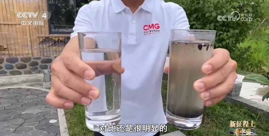 記者:這里是湖水。你看,這兩個(gè)杯子(里的水)處理之前跟處理之后對(duì)比還是很明顯的。