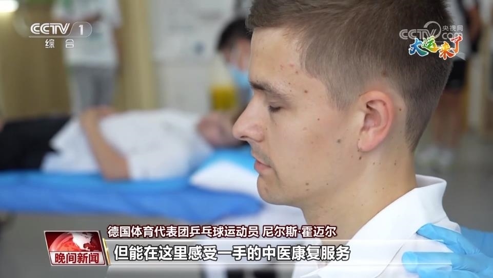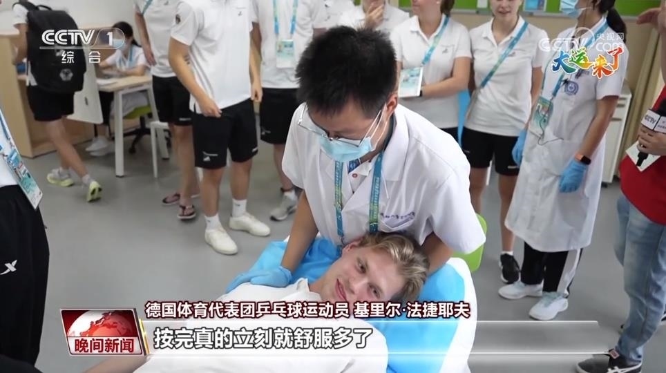 德國(guó)體育代表團(tuán)乒乓球運(yùn)動(dòng)員 尼爾斯·霍邁爾:不敢想象在大運(yùn)村還有這么好的醫(yī)療服務(wù),之前完全沒(méi)想到。在德國(guó)也有一些診所提供類似服務(wù),但能在這里感受一手的中醫(yī)康復(fù)服務(wù),真的太酷了。