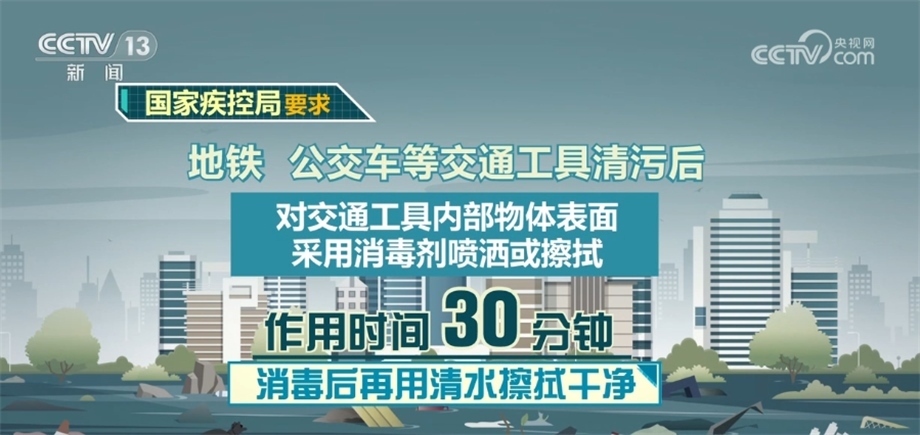 地鐵、公交車等交通工具清污后,對交通工具內(nèi)部物體表面采用消毒劑噴灑或擦拭,作用時(shí)間30分鐘,消毒后再用清水擦拭干凈。