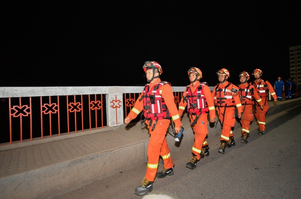 8月9日凌晨,在天津市靜海區(qū)臺(tái)頭鎮(zhèn),天津消防救援總隊(duì)的消防員巡查經(jīng)過(guò)革命橋。新華每日電訊記者孫凡越攝