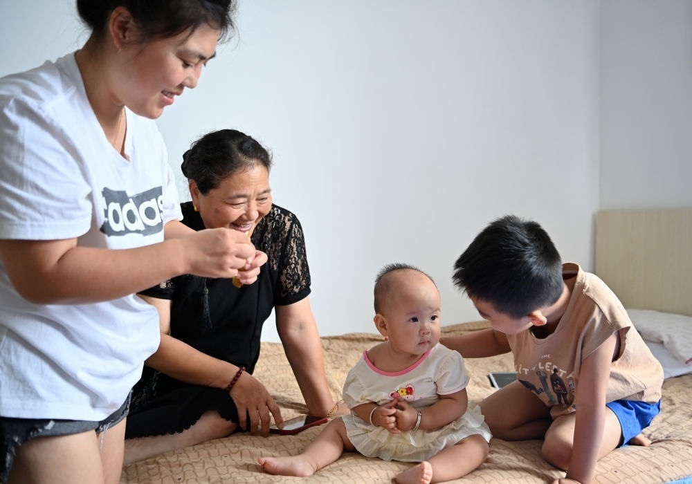 轉(zhuǎn)移群眾在天津市西青區(qū)親和儒園安置點(diǎn)內(nèi)照看小孩(8月9日攝)。新華每日電訊李然攝