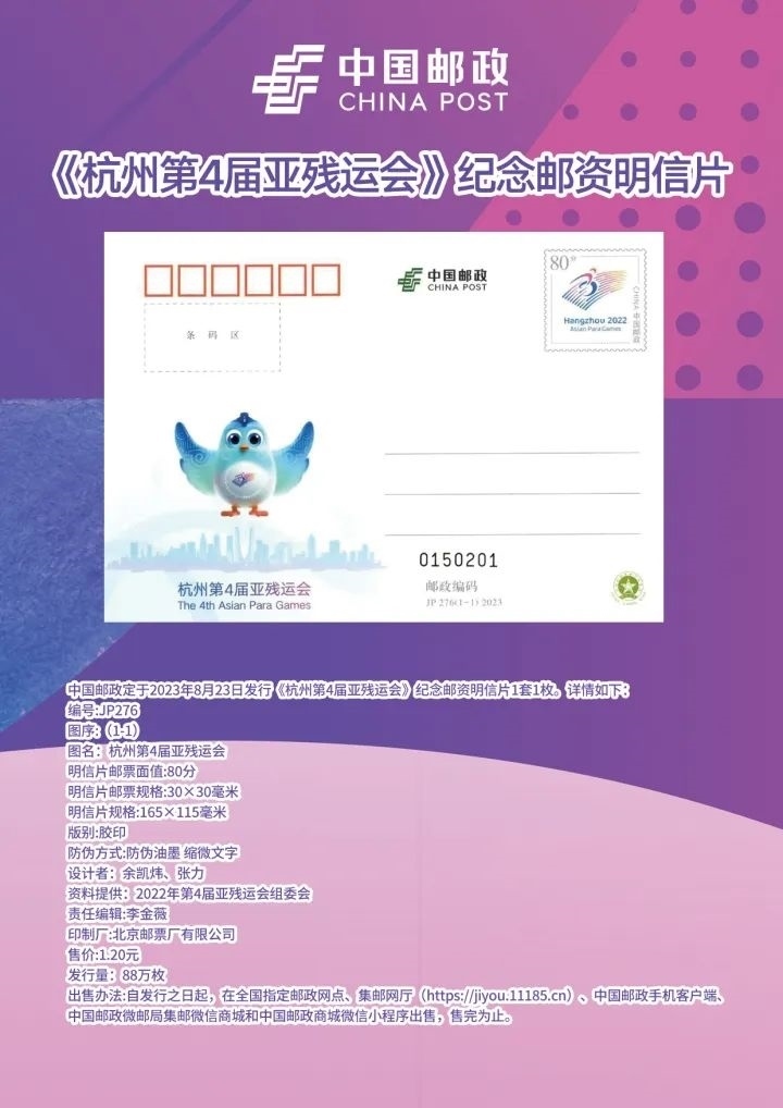 今天,中國(guó)郵政還發(fā)行了《杭州第4屆亞殘運(yùn)會(huì)》紀(jì)念郵資明信片一套1枚,編號(hào)為JP276。郵資圖為杭州亞殘運(yùn)會(huì)會(huì)徽,主體表現(xiàn)杭州亞殘運(yùn)會(huì)名稱和吉祥物飛飛,襯以杭州城市剪影,體現(xiàn)“兩個(gè)亞運(yùn),同樣精彩”的辦賽理念,激勵(lì)殘疾人運(yùn)動(dòng)員在競(jìng)技舞臺(tái)上,展現(xiàn)勇于挑戰(zhàn)、戰(zhàn)勝自我、創(chuàng)造幸福的良好精神風(fēng)貌。