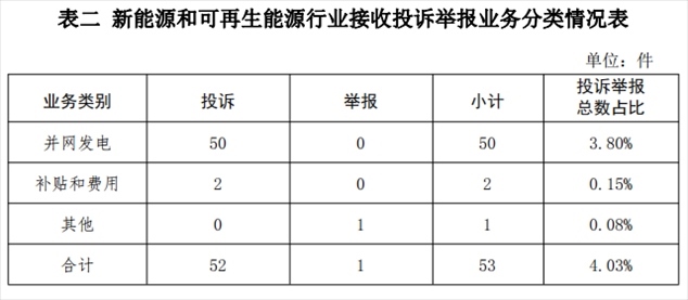 新能源和可再生能源行業(yè)排在第二位,數(shù)量為53件、占投訴舉報總數(shù)的4.03%,主要集中在并網(wǎng)發(fā)電、補(bǔ)貼和費用等方面。