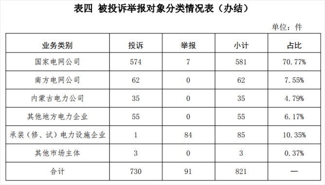 從被投訴舉報對象看,供電企業(yè)733件、占投訴舉報總數(shù)的89.28%,其中國家電網(wǎng)公司581件、占比70.77%,南方電網(wǎng)公司62件、占比7.55%,內(nèi)蒙古電力公司35件、占比3.65%,其他地方電力企業(yè)55件、占比6.17%;承裝(修、試)電力設(shè)施企業(yè)85件、占比10.35%;其他市場主體3件、占比0.37%。