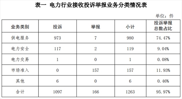 電力行業(yè)排在首位,數(shù)量為1263件、占投訴舉報總數(shù)的95.97%,主要集中在供電服務(wù)、市場準(zhǔn)入、電力安全等方面。