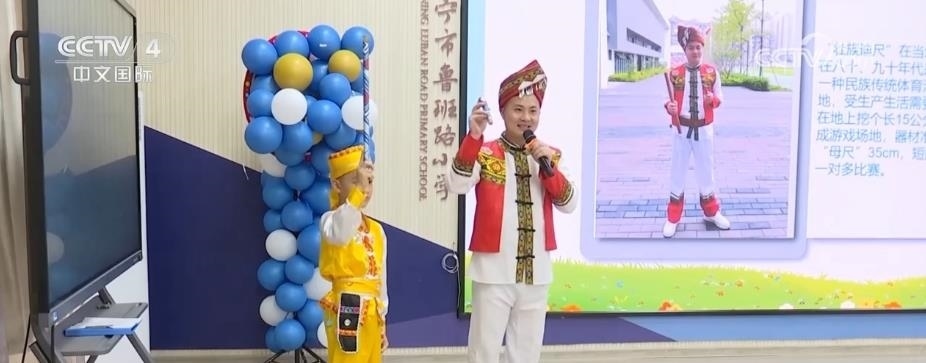 在南寧市魯班路小學(xué),同學(xué)們領(lǐng)略了獨(dú)具壯族特色的體育活動《迪尺小課堂》。同學(xué)們還在開學(xué)典禮上身穿自己設(shè)計制作的扎染服飾,手拿親手制作的紅陶、皮影等非遺作品,表演了一場非遺秀。