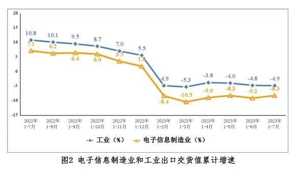 1—7月份,規(guī)模以上電子信息制造業(yè)出口交貨值同比下降8.3%,降幅較上半年收窄0.9個百分點(diǎn),比同期工業(yè)降幅深3.4個百分點(diǎn)。7月份,規(guī)模以上電子信息制造業(yè)出口交貨值同比下降5.1%。