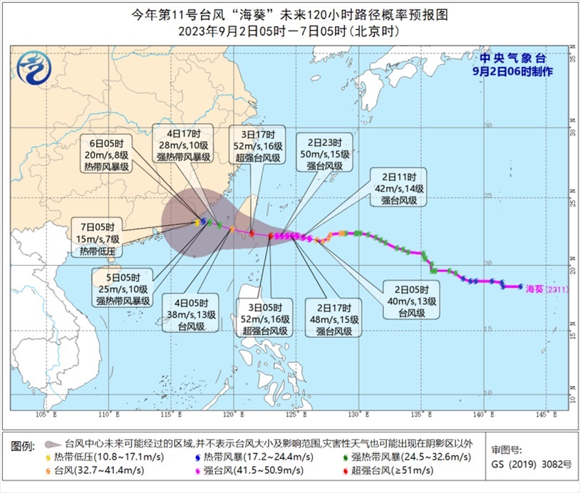 大風(fēng)預(yù)報:9月2日08時至3日08時,受“蘇拉”影響,南海西北部、北部灣東部、瓊州海峽及廣東沿海、廣西南部沿海、珠江口以及香港和澳門等地將有7-9級、陣風(fēng)10-11級的大風(fēng),“蘇拉”中心經(jīng)過的附近海面或地區(qū)風(fēng)力有12-13級、陣風(fēng)14-15級;受“??庇绊懀?/span>臺灣海峽、浙江南部沿海、福建沿海、廣東東部沿海、臺灣島沿海將有6-7級,陣風(fēng)8級大風(fēng),臺灣以東洋面部分海域風(fēng)力可達(dá)8-10級,陣風(fēng)11-12級,“??敝行慕?jīng)過的附近海面風(fēng)力可達(dá)12-13級,陣風(fēng)14級。