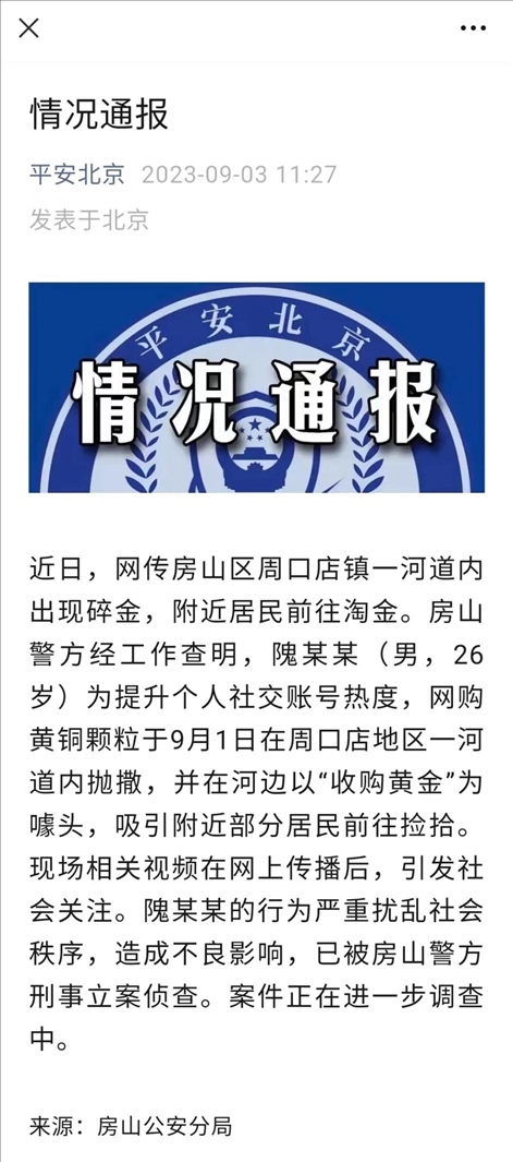 ·北京警方通報房山一河道出現(xiàn)碎金疑似物:實為一男子網(wǎng)購黃銅顆粒拋撒。