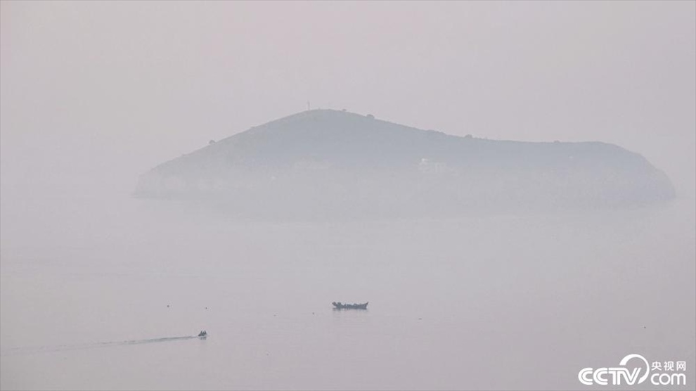 2023年9月3日清晨,大連,星海灣東部海域上空霧氣彌漫,島礁、漁船在霧中若隱若現(xiàn)。大連市氣象臺于當(dāng)日03時57分發(fā)布了海上大霧橙色預(yù)警信號。