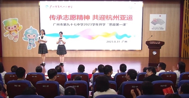 8月31日,廣州市第九十七中學(xué)開展以“傳承志愿精神、共迎杭州亞運”為主題的開學(xué)“思政第一課”。