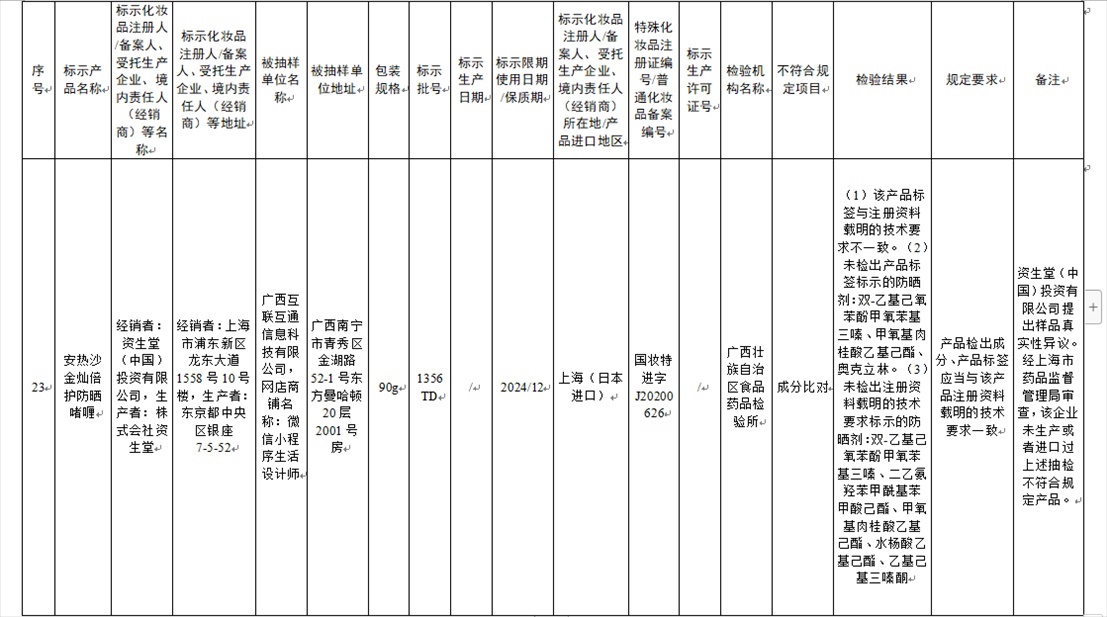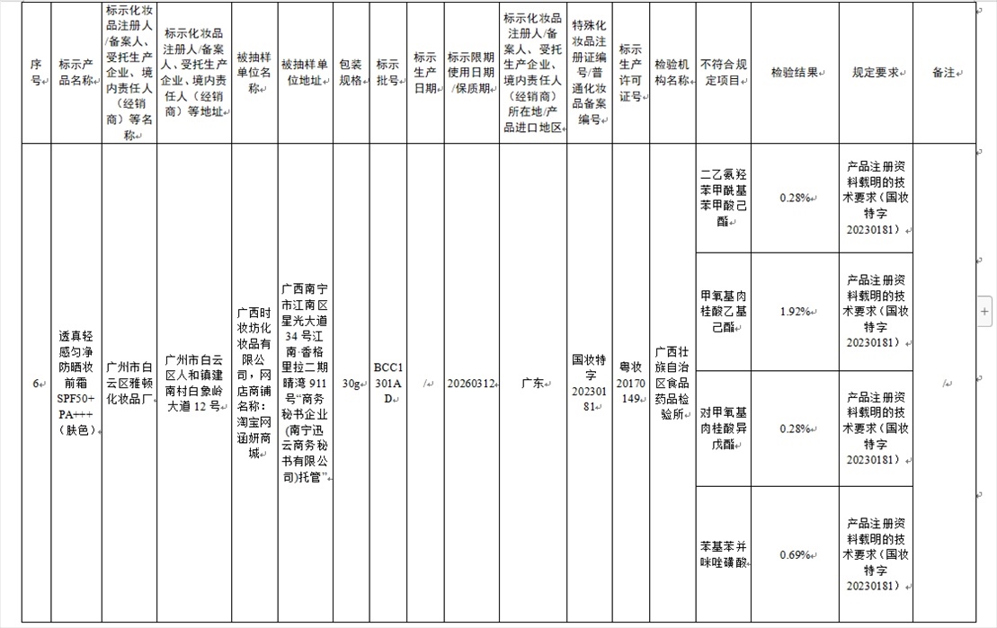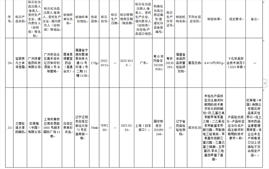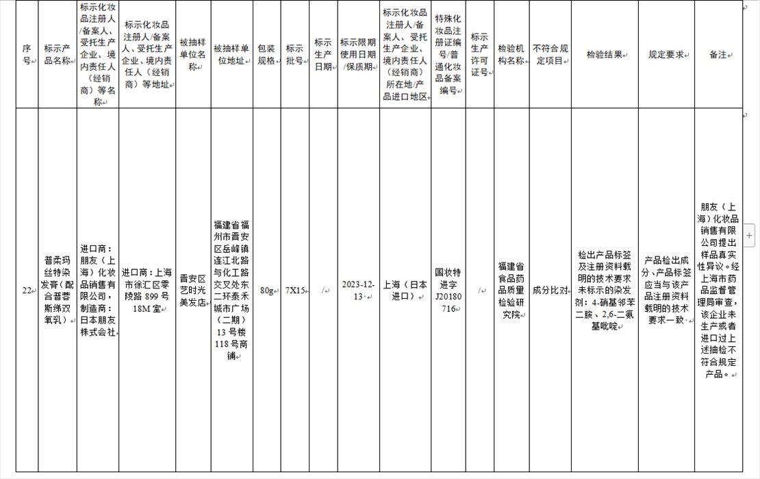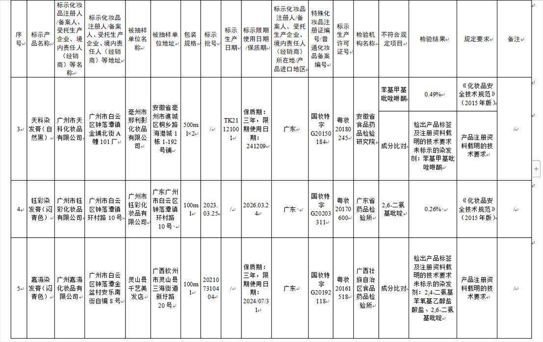 國(guó)家藥監(jiān)局網(wǎng)站今天發(fā)布通告稱,在2023年國(guó)家化妝品抽樣檢驗(yàn)工作中,經(jīng)重慶市食品藥品檢驗(yàn)檢測(cè)研究院等單位檢驗(yàn),產(chǎn)品標(biāo)簽標(biāo)示為廣州市天科化妝品有限公司生產(chǎn)的天科染發(fā)膏(自然黑)等23批次化妝品不符合規(guī)定(見(jiàn)下圖表格)。