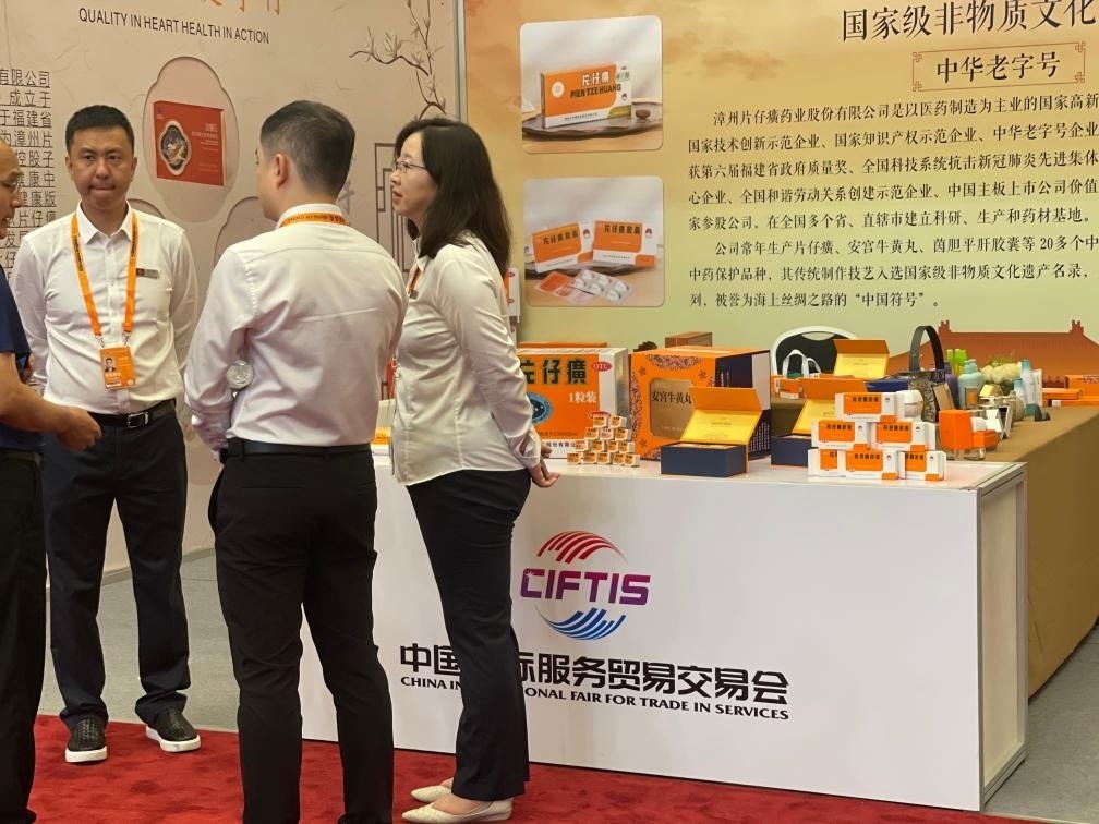 2023年服貿(mào)會期間中醫(yī)藥展區(qū),工作人員在交流洽談。新華社記者 李恒 攝