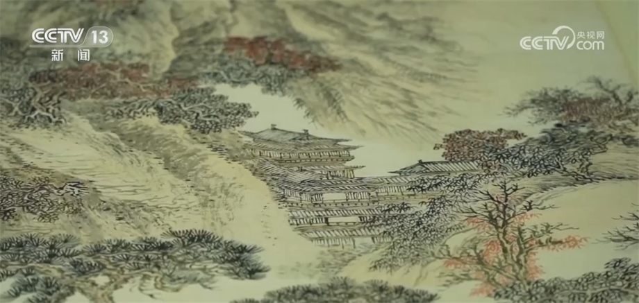這幅《秋林書屋圖》,是清初四王之一、非常著名的畫家王翚在79歲的時候創(chuàng)作的,是珍貴的國家一級文物。這幅畫呈現(xiàn)的就是文人在山中茅屋當(dāng)中讀書的一個情景。雖然300多年的時間過去了,但是展開這幅畫,我們?nèi)匀豢梢钥吹椒浅ur明的色彩,蒼林翠竹與霜葉秋楓交相輝映,給我們帶來非常美的視覺享受。