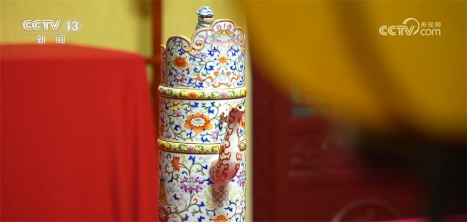 總臺記者 楊雪:沈陽故宮當(dāng)中的很多珍貴院藏文物都見證了多民族文化融合的過程,像我們眼前看到的這款清乾隆款粉彩多穆壺就是其中之一。多穆在藏語當(dāng)中是奶茶桶的意思,直到現(xiàn)在,像銅制、木制、皮質(zhì)的很多多穆壺仍然被蒙、藏等少數(shù)民族沿襲使用著。大家可以看到,這款多穆壺的蓋子上蹲坐著一只非常靈動的小獅子,有祈福和護佑主人的意思。這件多穆壺是國家一級文物,距今已經(jīng)有200多年的歷史了。