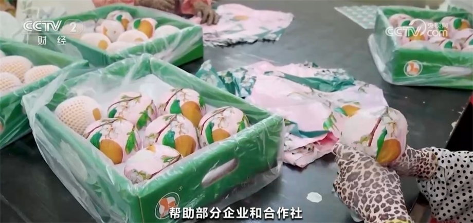 在當(dāng)?shù)匾患液献魃纾浾呖吹?,工人們正在分揀果子,套袋裝箱,這些秋月梨將銷往全國各地。