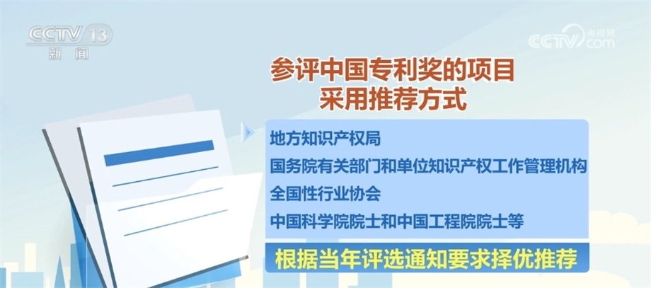 參評中國專利獎的項目采用推薦方式,由地方知識產(chǎn)權(quán)局、國務院有關(guān)部門和單位知識產(chǎn)權(quán)工作管理機構(gòu)、全國性行業(yè)協(xié)會、中國科學院院士和中國工程院院士等根據(jù)當年評選通知要求擇優(yōu)推薦。經(jīng)過評審之后,在國家知識產(chǎn)權(quán)局政府網(wǎng)站公示評選結(jié)果,接受社會監(jiān)督。