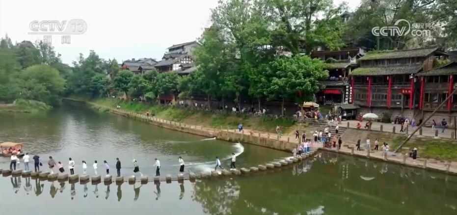 在四川洪雅縣的柳江古鎮(zhèn),當?shù)赝瞥鰧嵕把莩觥⒔?jīng)典誦讀、非遺巡演等多項活動。游客們漫步于山水如畫的詩意古鎮(zhèn)中,觀看水上實景演出,感受非遺民俗魅力,歡度假期。