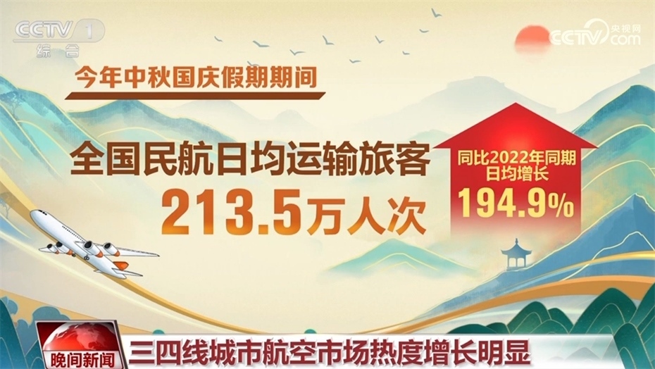 民航方面,今年中秋國慶假期期間,全國民航日均運輸旅客213.5萬人次,同比2022年同期日均增長194.9%。除了北京、上海、重慶、三亞等熱門城市航線火爆外,三四線城市的航空市場熱度增長明顯,直接帶動了當?shù)氐慕洕?/p>