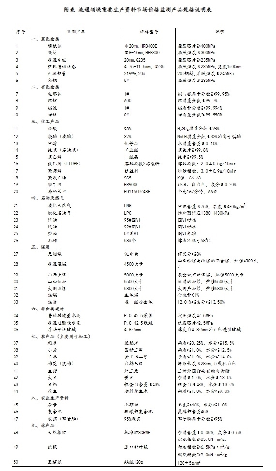 流通領(lǐng)域重要生產(chǎn)資料市場(chǎng)價(jià)格監(jiān)測(cè)內(nèi)容包括9大類(lèi)50種產(chǎn)品的價(jià)格。類(lèi)別與產(chǎn)品規(guī)格說(shuō)明詳見(jiàn)附表。
