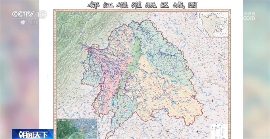 四川省都江堰水利發(fā)展中心副主任 吳鑒:這幅圖是在新中國成立之前的一張都江堰灌溉的平面圖。從圖上可以顯示,(當時)整個都江堰只灌溉了14個縣282萬畝的農田。這是我們今年新繪制的都江堰灌溉區(qū)域圖。從這個圖上可以看到,以都江堰作為頂沖點,整個都江堰灌區(qū)變得更大了,扇面進一步擴大了。