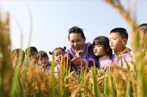 10月16日, 世界糧食日。山東臨沂沂南縣大莊鎮(zhèn),小朋友在稻田聽老師講解水稻種植知識。