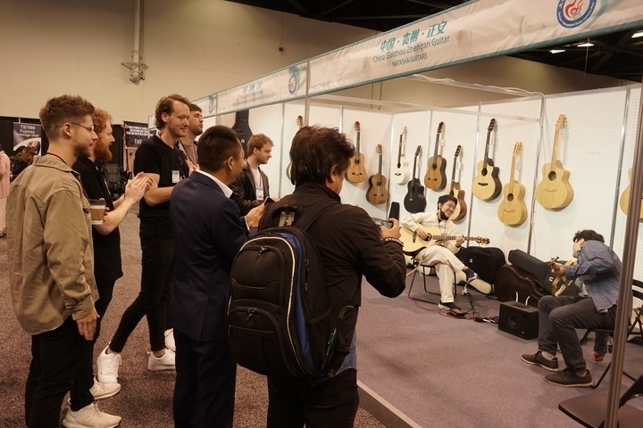 4月13日,在美國(guó)加利福尼亞州阿納海姆會(huì)展中心,參觀者在中國(guó)貴州正安吉他產(chǎn)業(yè)園一家公司展位觀看樂(lè)器表演。