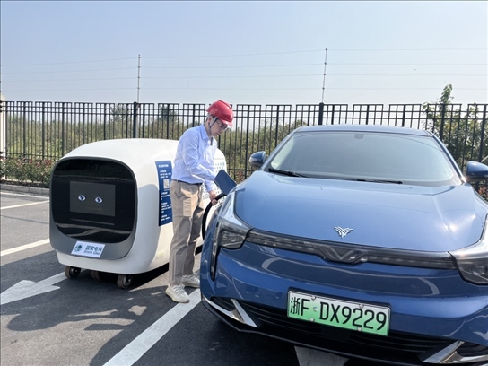 ?2023年10月17日,國(guó)網(wǎng)浙江電力工作人員在烏鎮(zhèn)使用首臺(tái)智能移動(dòng)充電機(jī)器人為新能源汽車充電。新華網(wǎng)發(fā) 沈佳煒 攝