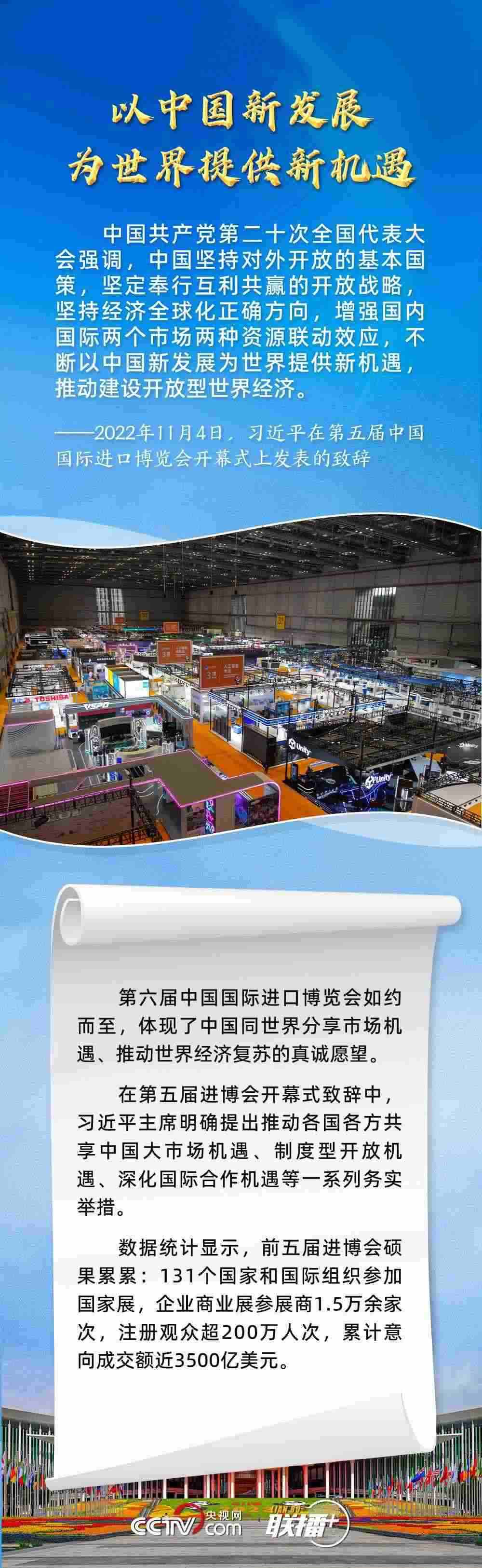 11月5日,第六屆中國國際進口博覽會在上海開幕。習(xí)近平主席在致信中指出,2018年以來,進博會成功舉辦五屆,依托中國大市場優(yōu)勢,發(fā)揮國際采購、投資促進、人文交流、開放合作平臺功能,對加快構(gòu)建新發(fā)展格局和推動世界經(jīng)濟發(fā)展作出了積極貢獻。