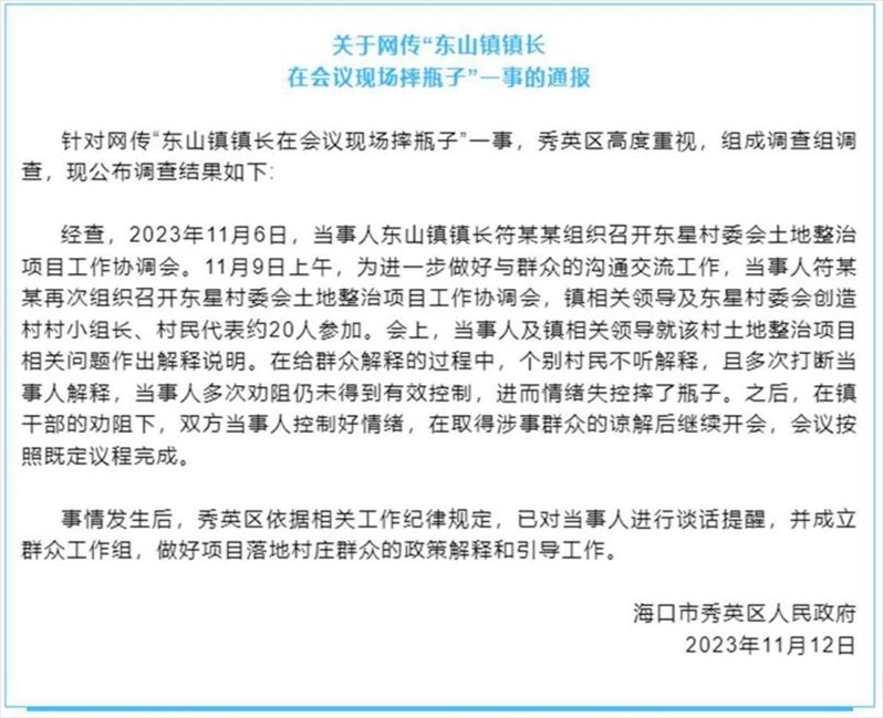 ·??谛阌^(qū)通報“東山鎮(zhèn)鎮(zhèn)長在會議現(xiàn)場摔瓶子”:已對當事人進行談話提醒。