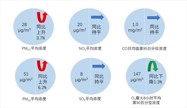 1—10月,全國339個(gè)地級(jí)及以上城市平均空氣質(zhì)量?jī)?yōu)良天數(shù)比例為85.1%,同比下降1.2個(gè)百分點(diǎn),較2019年同期上升2.9個(gè)百分點(diǎn);平均重度及以上污染天數(shù)比例為1.6%,同比上升0.8個(gè)百分點(diǎn),較2019年同期下降0.1個(gè)百分點(diǎn);PM2.5平均濃度為28微克/立方米,同比上升3.7%,較2019年同期下降17.6%;O3平均濃度為147微克/立方米,同比下降1.3%,較2019年同期下降2.6%;PM10平均濃度為51微克/立方米,同比上升6.2%;SO2平均濃度為8微克/立方米,同比持平;NO2平均濃度為20微克/立方米,同比持平;CO平均濃度為1.0毫克/立方米,同比持平。
