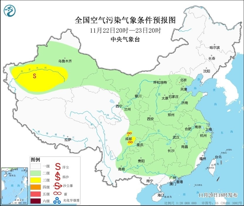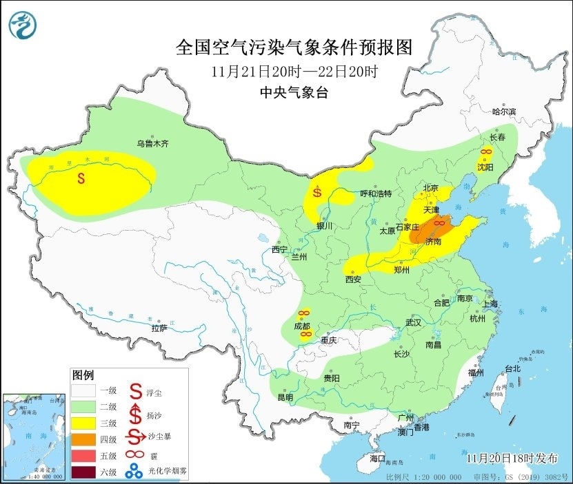 20日夜間到21日,山西南部、陜西關(guān)中等地的部分地區(qū)有輕度霾天氣。