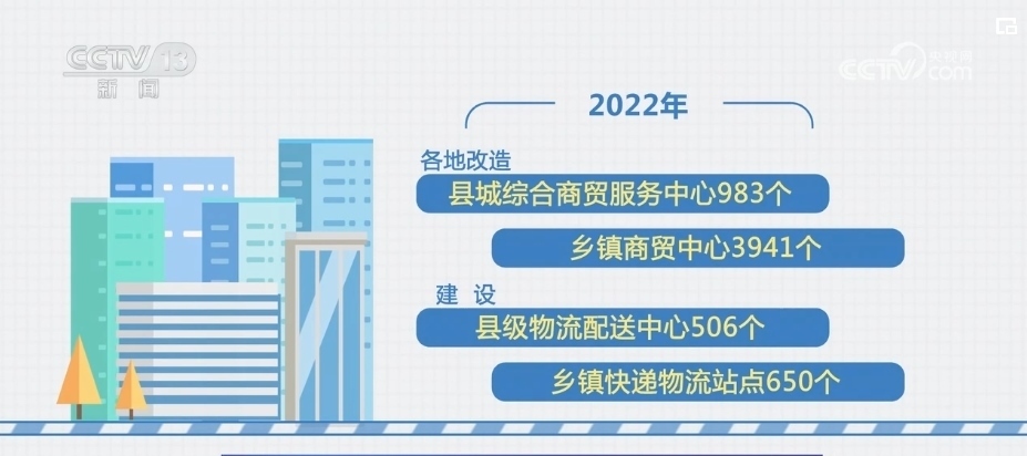 2022年,各地改造縣城綜合商貿(mào)服務中心983個、鄉(xiāng)鎮(zhèn)商貿(mào)中心3941個,建設(shè)縣級物流配送中心506個、鄉(xiāng)鎮(zhèn)快遞物流站點650個。