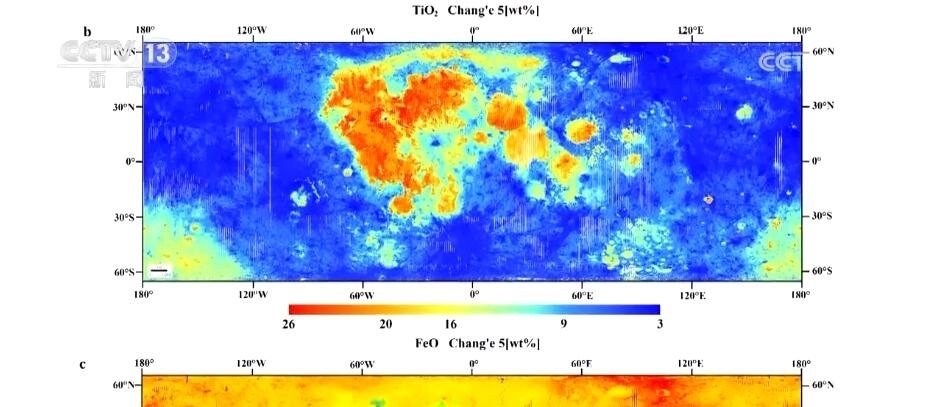吉林大學(xué)地球科學(xué)學(xué)院教授 楊晨:之前我們主要采用的月球表面元素成分圖,主要是基于美國和蘇聯(lián)的樣品數(shù)據(jù),主要反映的是月球30億年前的演變。我國采樣的嫦娥五號(hào)數(shù)據(jù),可以反映年輕的、20億年以來的月球歷史。我們基于嫦娥五號(hào)樣品數(shù)據(jù),獲得了月球表面六種主要元素在月球上的分布情況。其中,紅色部分代表元素含量相對(duì)較高,比如鈦和鐵。我們發(fā)現(xiàn)在月海附近(區(qū)域),它們的含量相對(duì)豐富,這兩種元素對(duì)于判定年輕月海玄武巖具有重要意義。
