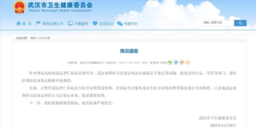 ·武漢衛(wèi)健委通報(bào)“普仁醫(yī)院從事代孕、武漢瑞博祥司法鑒定所出具虛假親子鑒定”情況。