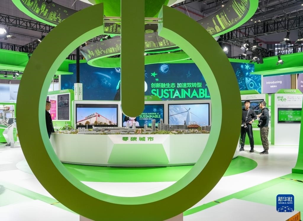 這是第六屆中國(guó)國(guó)際進(jìn)口博覽會(huì)施耐德電氣展臺(tái)展出的“零碳城市”愿景模型(2023年11月9日攝)。新華社記者 丁汀 攝