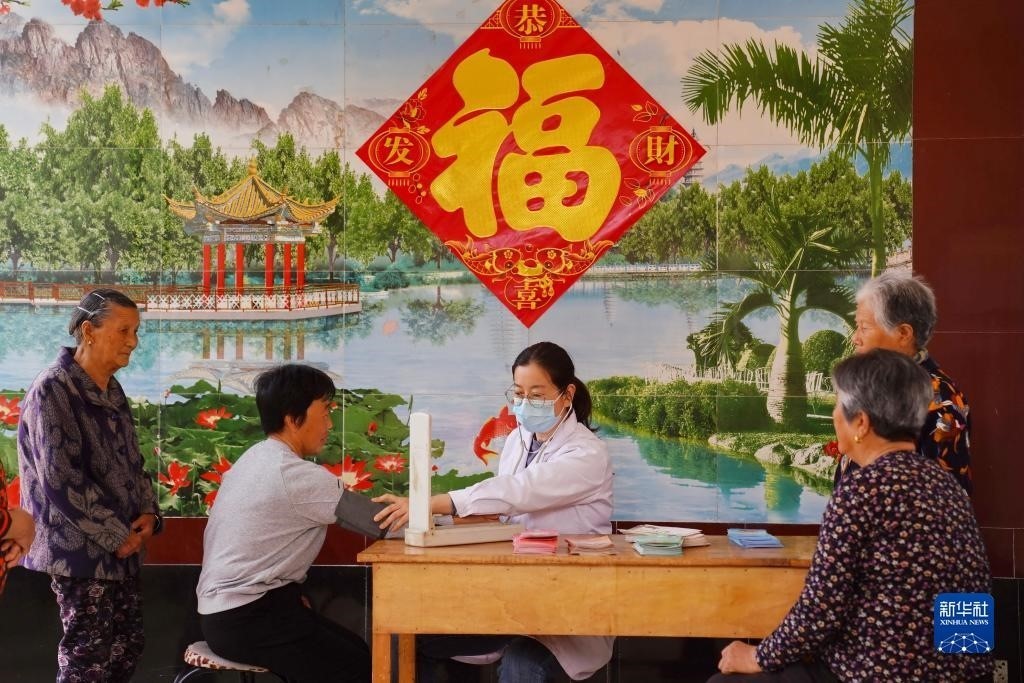 河北省平鄉(xiāng)縣尋召村村醫(yī)在“幸福小院”內(nèi)為老人們量血壓(2023年4月20日攝)。近年來,河北省平鄉(xiāng)縣利用農(nóng)村閑置院落,按照“就近集中、鄰里互助、抱團(tuán)養(yǎng)老”的模式,采取社會捐助、鄉(xiāng)村籌集、縣財政補(bǔ)助等形式,先后打造出300余個“幸福小院”。新華社記者 牟宇 攝
