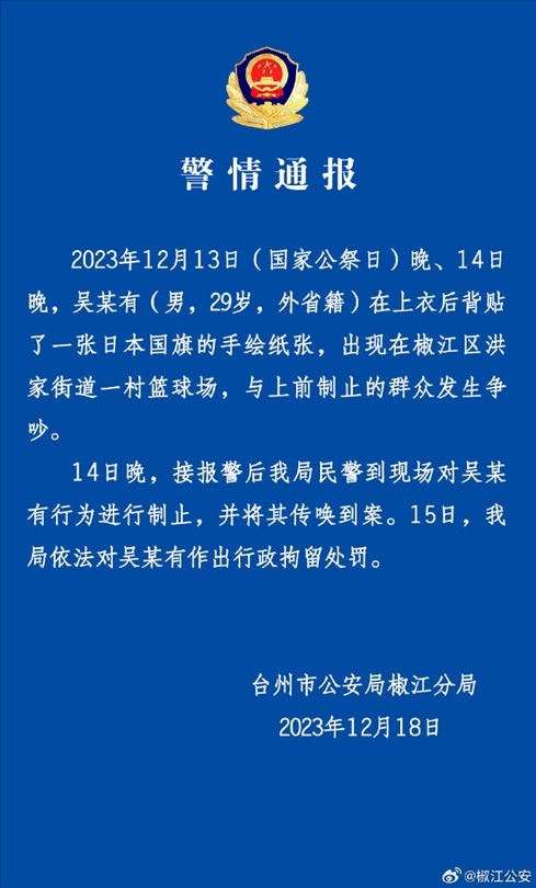 ·國(guó)家公祭日一男子身貼日本國(guó)旗出行?椒江警方:依法行政拘留。