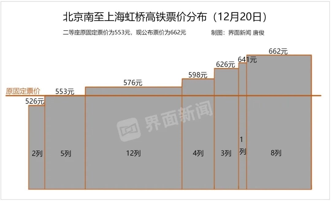 以京滬高鐵為例,此前全程二等座的固定票價(jià)為553元,現(xiàn)在的公布票價(jià)為662元。12月20日,北京南站至上海虹橋站開(kāi)行35趟列車,其中只有2趟列車二等座票價(jià)低于553元,有5趟列車與原固定票價(jià)持平,其余80%列車高于原票價(jià)。漲價(jià)的列車中,8趟列車的實(shí)際票價(jià)與公布票價(jià)(662元)一致。