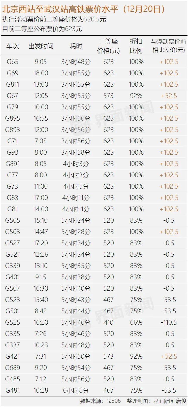 根據(jù)界面新聞統(tǒng)計(jì),12月20日,北京西站至武漢站共有30趟高鐵開(kāi)行,其中16趟列車與原來(lái)相比票價(jià)上漲,14趟列車票價(jià)下降。票價(jià)上漲的列車中,大部分按照最高的公布票價(jià)定價(jià),相當(dāng)于上漲了102.5元;票價(jià)下降的列車中,只有少數(shù)列車降低了50多元。