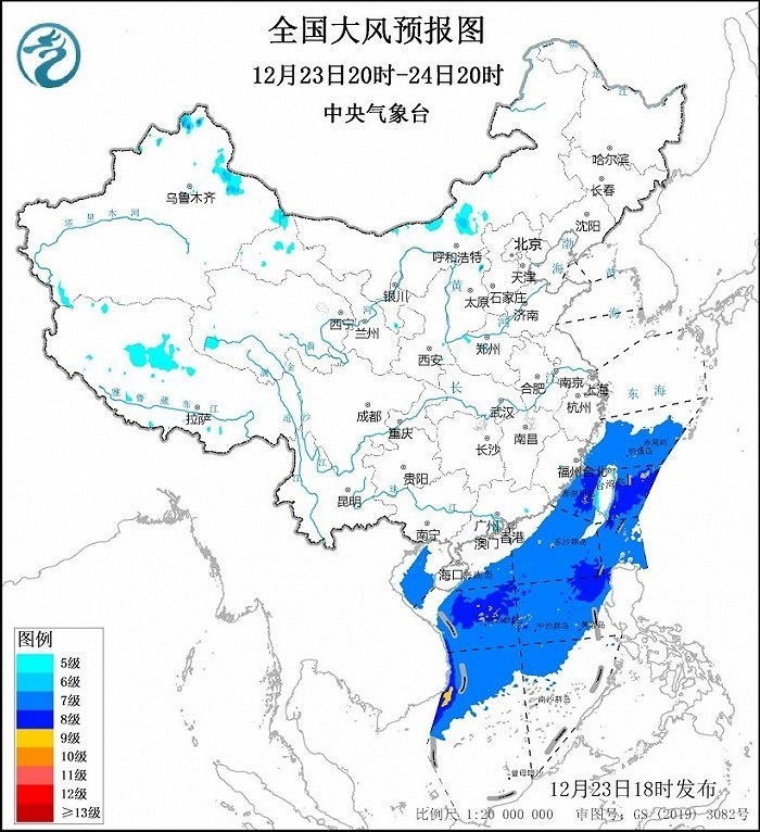 中央氣象臺12月23日18時繼續(xù)發(fā)布大風(fēng)藍(lán)色預(yù)警:預(yù)計,12月23日20時至24日20時,東海南部海域、臺灣海峽、臺灣以東洋面、巴士海峽、南海大部海域、北部灣將有7~8級、陣風(fēng)9~10級的東北風(fēng),其中南海西南部的部分海域風(fēng)力可達(dá)9級、陣風(fēng)10級。