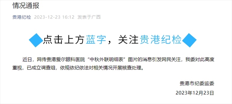 ·貴港市紀(jì)委通報(bào)“網(wǎng)傳愛爾眼科中秋外聯(lián)明細(xì)表”:已成立調(diào)查組,對(duì)相關(guān)情況開展核查處理。據(jù)早前報(bào)道,網(wǎng)友爆料發(fā)布了兩張標(biāo)為“中秋外聯(lián)明細(xì)表”的圖片,其中涉及42名公職人員以及59000元額度的購物卡,并在評(píng)論中透露上述圖片的涉事單位為貴港愛爾眼科醫(yī)院。