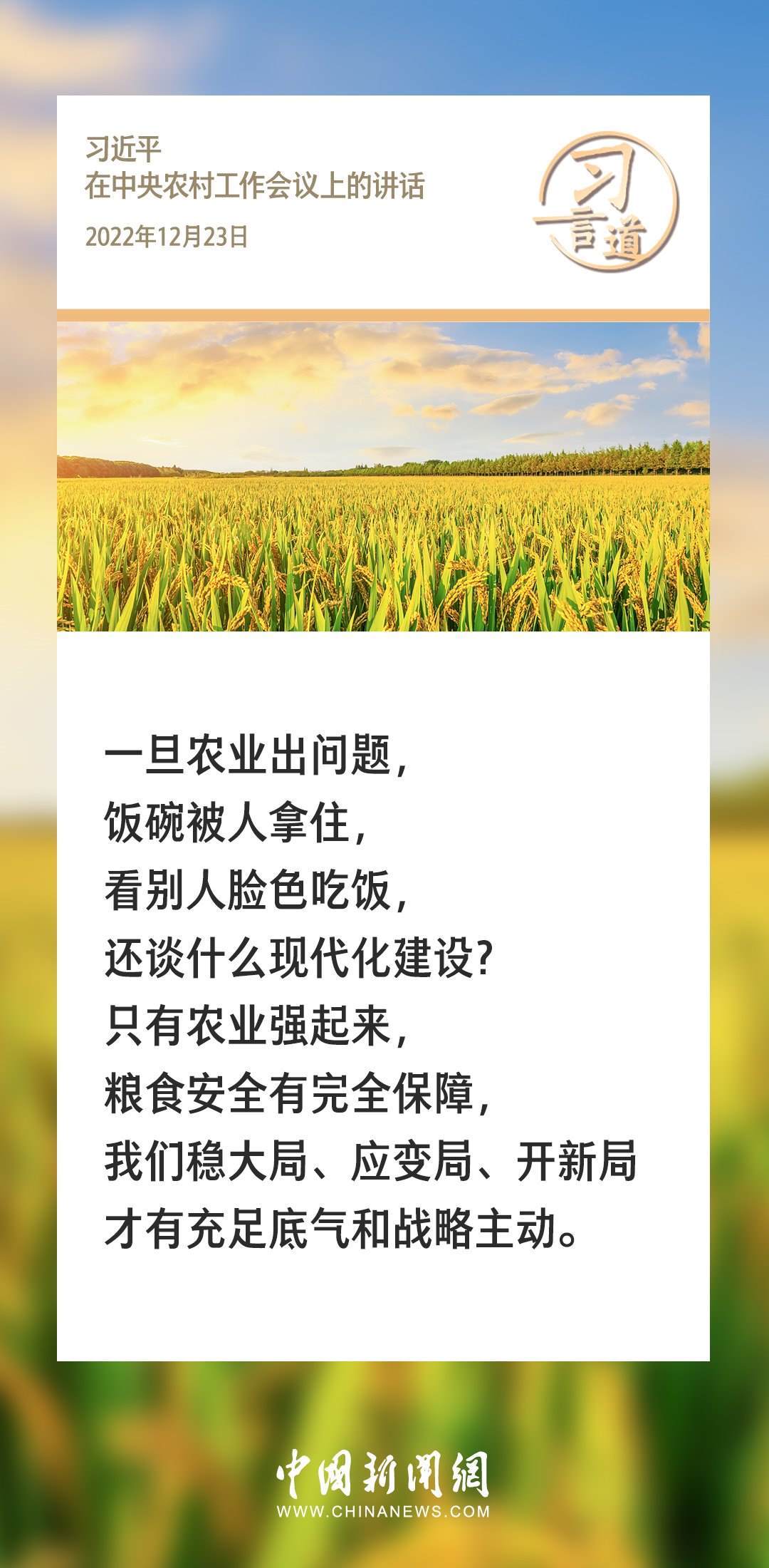 農(nóng)為邦本,本固邦寧。習(xí)近平總書記多次在不同場合就“三農(nóng)”工作發(fā)表重要講話、作出重要部署,始終堅持把解決好“三農(nóng)”問題作為全黨工作的重中之重。